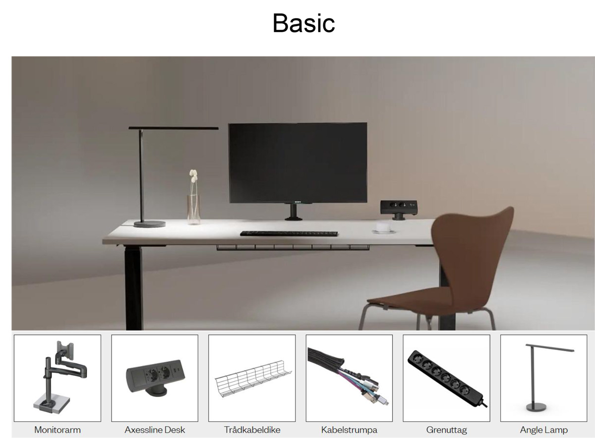 Arbetsplats Basic Arbetsplatslösningar - Välj rätt tillbehör för skrivbordet Ett paket som passar bäst för kontoret där medarbetarna har sina egna skrivbord. Rätt placering av monitor ger en ergonomisk arbetsställning och en Axessline Desk ger såväl eluttag som laddning (USB-A och USB-C) i bordsskivans bakkant (slipp sladdkaos och krypande under bordet). Lampan Angle har hela fem ljusstyrkor att välja mellan och ett tidlöst, elegant formspråk. Med våra paket är det lätt att hitta skräddarsydda lösningar för just era behov. Vill ni ha det mest nödvändiga, eller ett premiumpaket med extra allt till skrivbordet? Känner ni att det är svårt att veta vad ni behöver för att skapa en funktionell, uppkopplad och stilren arbetsplats? Lugn, vi hjälper er gärna. Vi vet att några väl utvalda detaljer gör hela skillnaden, därför har vi satt ihop förslag på paketlösningar för att göra era val enklare. Med våra produkter frigör ni arbetsyta och skapar harmoni i vardagen. Ni kan givetvis lägga till, ta bort och kombinera precis som ni vill. Merparten av våra produkter finns också i färgerna svart, vit och silver. Kontakta oss om du undrar över något eller vill beställa.