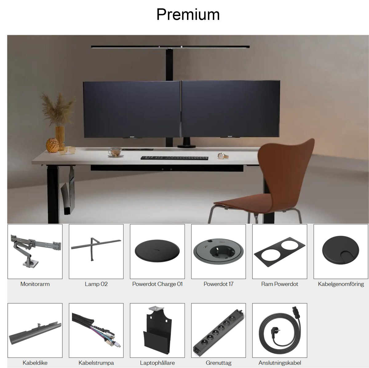 Arbetsplats Premium Arbetsplatslösningar - Välj rätt tillbehör för skrivbordet Paketet för er med högsta krav på funktion, ergonomi och lättillgänglig laddning samt med belysning i världsklass. Allt förpackat i en sober design med vackra linjer och en känsla för detaljer som lyfter och ger karaktär till alla arbetsplatser. Laptopen placeras enkelt under bordet och den gasfjädrade, monitorarmen Elevate Duo-bar passar perfekt för er som arbetar med dubbla skärmar och har höga krav på enkel inställning av dessa. En trådlös laddare och en Powerdot säkrar näst intill obegränsad laddning/uppkoppling. Med en hel meter ljus lyser den exklusiva lampan Lamp 02 upp er arbetsplats. Bakom det stilrena formspråket och den avskalade designen finns en kraftfull belysningslösning som med intuitiva kontroller ger dig allt från varm stämningsbelysning till laboratoriets klara ljusbild. Med våra paket är det lätt att hitta skräddarsydda lösningar för just era behov. Vill ni ha det mest nödvändiga, eller ett premiumpaket med extra allt till skrivbordet? Känner ni att det är svårt att veta vad ni behöver för att skapa en funktionell, uppkopplad och stilren arbetsplats? Lugn, vi hjälper er gärna. Vi vet att några väl utvalda detaljer gör hela skillnaden, därför har vi satt ihop förslag på paketlösningar för att göra era val enklare. Med våra produkter frigör ni arbetsyta och skapar harmoni i vardagen. Ni kan givetvis lägga till, ta bort och kombinera precis som ni vill. Merparten av våra produkter finns också i färgerna svart, vit och silver. Kontakta oss om du undrar över något eller vill beställa.