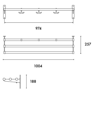 Standardmått inkl. konsoler: B: 1004 D: 257 H: 188 mm. Mått mellan skruvhål på konsoler är 974 mm.