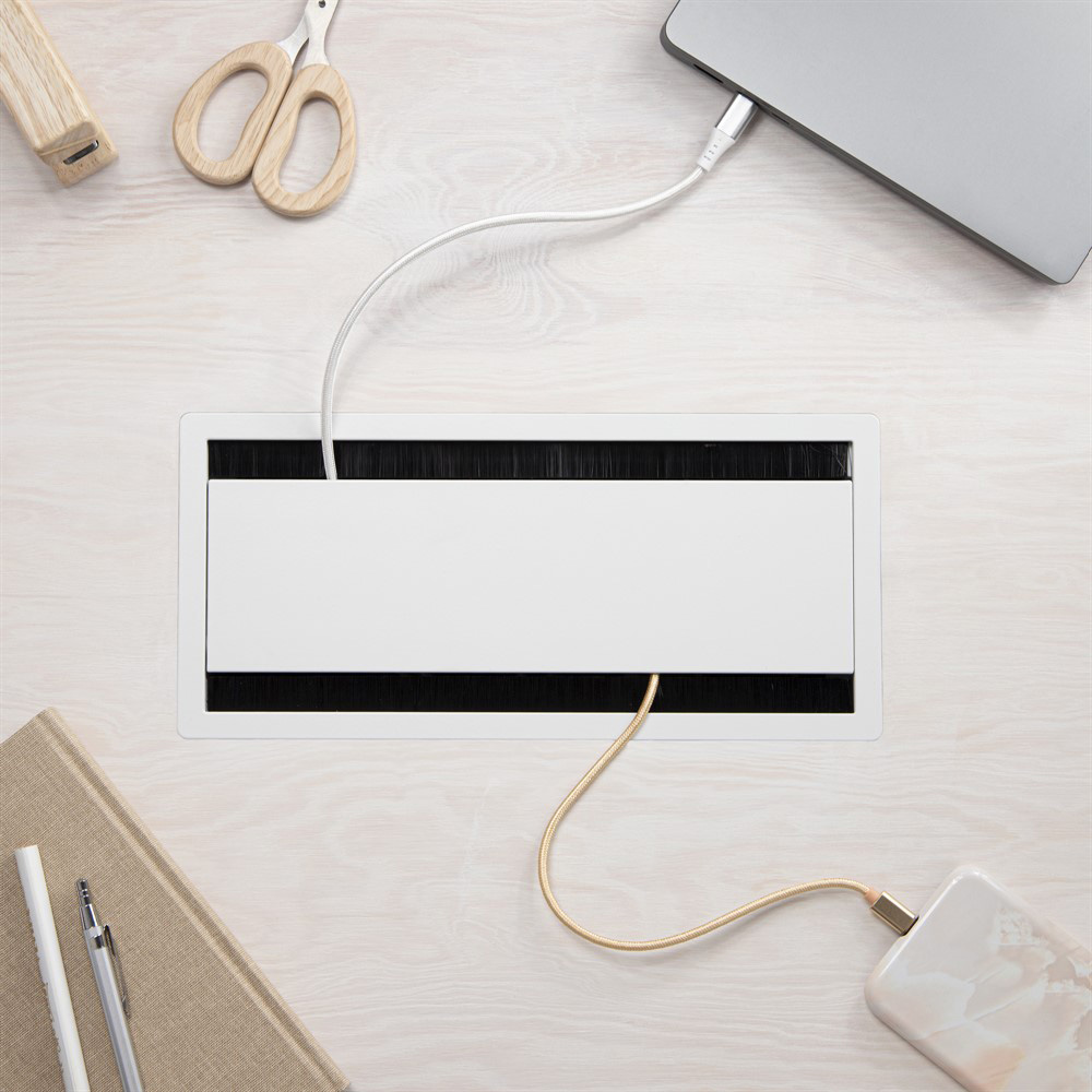 Göm sladdar och strömkablar enkelt och diskret med vårt eleganta, nersänkta bordslock med raka, minimalistiska linjer. Locket monteras infällt i eller på mötesbordet. Det infällda locket skapar en perfekt slät yta som vackert smälter in i alla bord. En mjukstängande duo switch-funktion gör att det även går att öppna och stänga från två håll för enkel åtkomst från båda sidor av bordet. Med sitt rena uttryck i matt aluminium är locket ett perfekt val för det medvetna kontoret och mötesrummet, där både design och kvalitet är av största betydelse. Välj mellan färgerna svart och vit. Locken finns i storlekarna 300 mm och 600 mm. Glöm inte att även välja till en av våra passande uttagsbrunnar för optimal funktion.