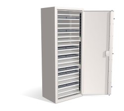 Robust och ventilerat laptopskåp, SS3492:2005, för säker förvaring av bl.a. laptop och läsplattor under laddning. Skåpet är tomt. Rymmer max 40 laptops. Standardlås omställbart nyckellås.