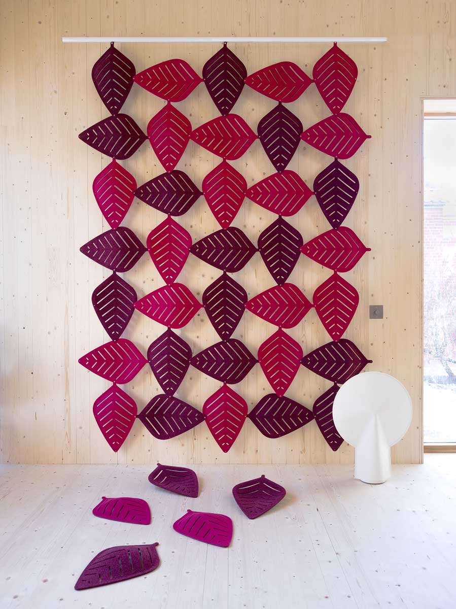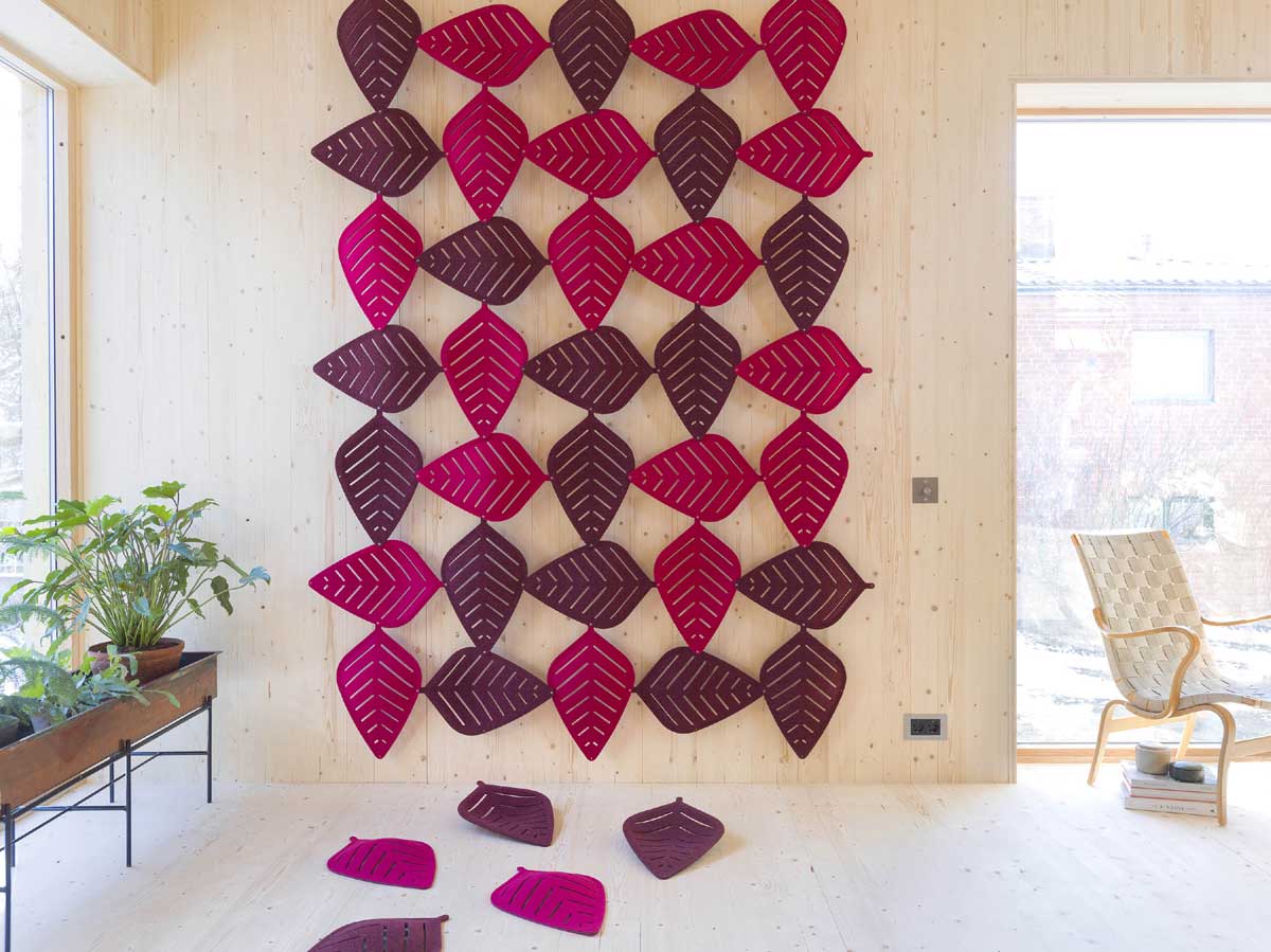 Airleafs lövformade moduler är gjorda för att kombineras till ljuddämpande avskärmningar i en mångfald av mönster och format. Airleaf är tillverkad i formpressad tygbeklädd fiberfilt och monteras ihop med hjälp av små plastclips. Airleaf finns i olika färger och kan hängas fritt från taket eller mot vägg via en aluminiumskena. Skenan levereras med ändstopp, tak- och väggfäste samt 10/20 st upphängningsbeslag. Pris för ljudabsorbenten är för 3-pack. Den finns även i 10-pack.