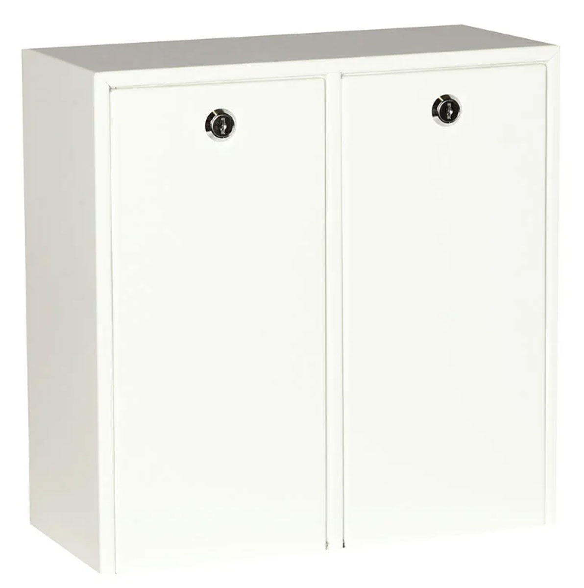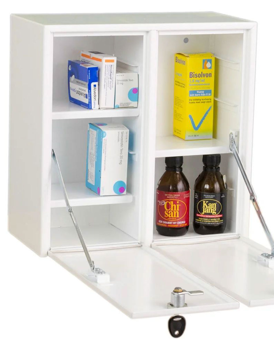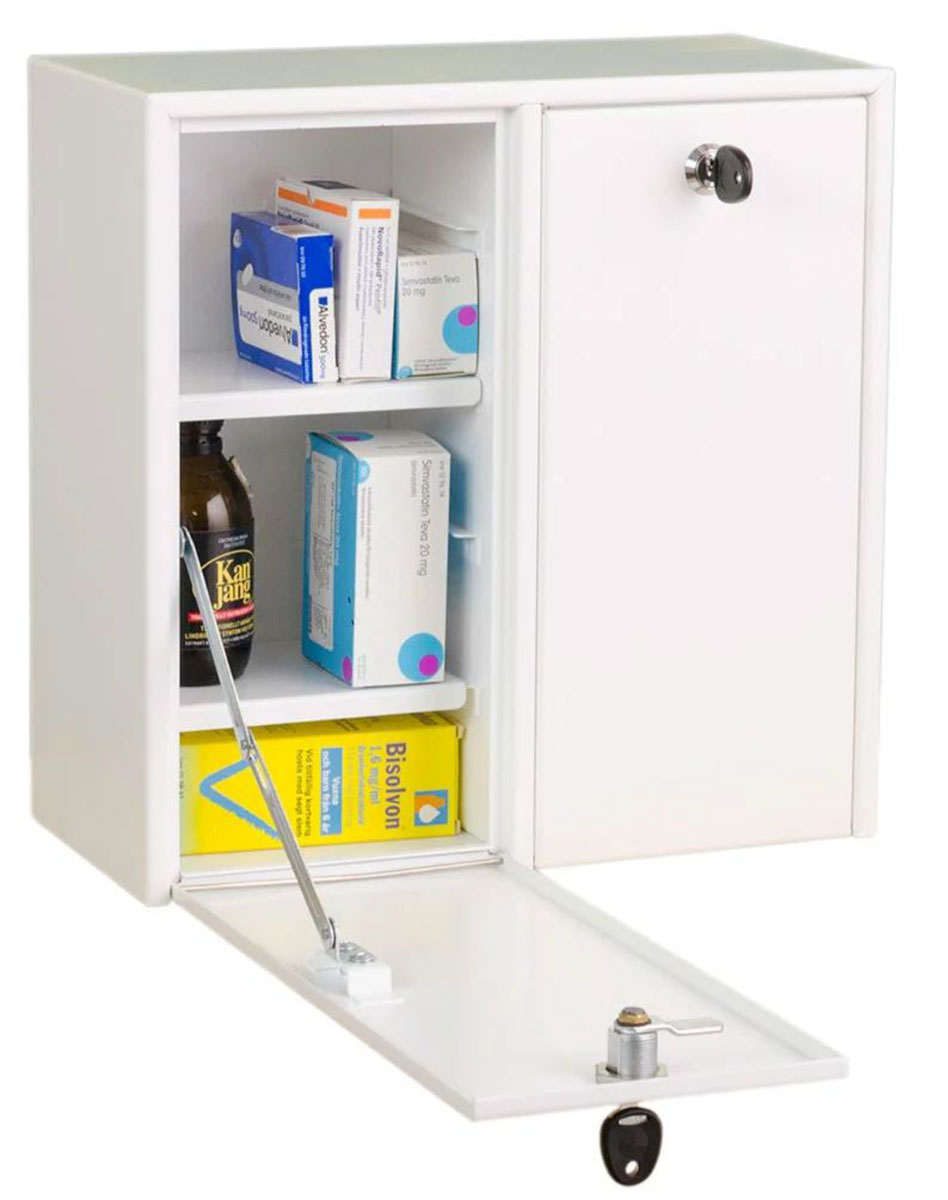 Inbrottsfördröjande medicinskåp för förvaring av läkemedel. 3 flyttbara hyllor, 2 dörrar (med separata lås) som öppnas framåt och kan med fördel användas som avlastningsyta. Skåpets båda dörrar stängs inne i skåpskroppen varför skåpet kan monteras mot annat skåp. Går att få med elkodlås eller RFID lås som tillval