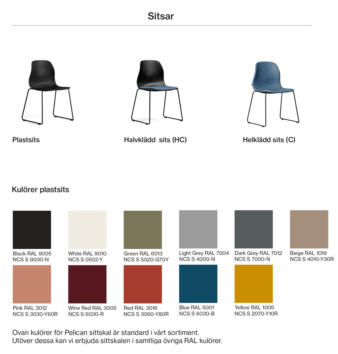 Pelican 09 medstativben är en smäcker stol med mjuka linjer av 100% återvunnen plast som dessutom är första stol i Sverige att erhålla EU Ecolabel. Pelican är en lättviktig, stapelbar stol med yttersta sittkomfort i återvunnet material. Formgiven av Johan Lindstén. Återvunnen PP (Polypropen) där andel återvunnen plast är 50–100 %. Stolen är förstärkt med 20 % glasfiber. Den återvunna plasten kommer från livsmedelsindustrin. Färg på sitsen finns i flera standardfärger. Sitsen går även att få i övriga RAL-färger. Kontakta oss för info och pris om ni önskar annan färg än standard. Underredet finns i svart, vitt, multicolour (epoxylack) och krom. Om multicolour tillkommer en startavgift per kulör. Stolen är staplingsbar.