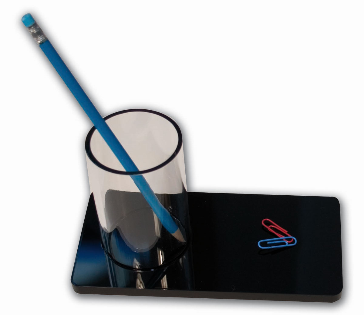 Pennställ med magnetisk gemhållare i akrylSnyggt formgivet, handtillverkat pennställ med magnetisk gemhållare i akryl. Pennstället är i svart och transparent akryl med måttet 97x179x90 mm.
