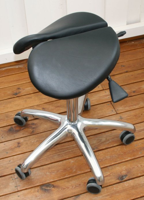 Sadelstolen med tvådelat sits där vidden går att justera. Lutningsmekanism som standard. Tränar effektivt ländryggen och bäckenbottensmuskulaturen. Ger automatiskt rätt hållning vilket innebär att ligamenten ej töjs ut och diskarna i ryggen inte blir skadligt pressade. Spänningar i axlar och nacke avtar tack vare bättre hållning i bröstryggen och nacken. Den tvådelade sitsen är även fördelaktig för din genitala hälsa. Blodcirkulationen ökar i bäckenområdet.