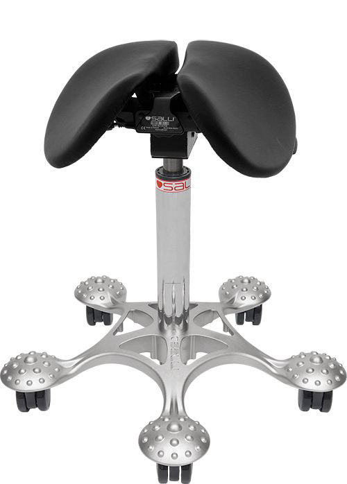 Sadelstolen med tvådelat sits där vidden går att justera. Lutningsmekanism som standard. Tränar effektivt ländryggen och bäckenbottensmuskulaturen. Ger automatiskt rätt hållning vilket innebär att ligamenten ej töjs ut och diskarna i ryggen inte blir skadligt pressade. Spänningar i axlar och nacke avtar tack vare bättre hållning i bröstryggen och nacken. Den tvådelade sitsen är även fördelaktig för din genitala hälsa. Blodcirkulationen ökar i bäckenområdet.