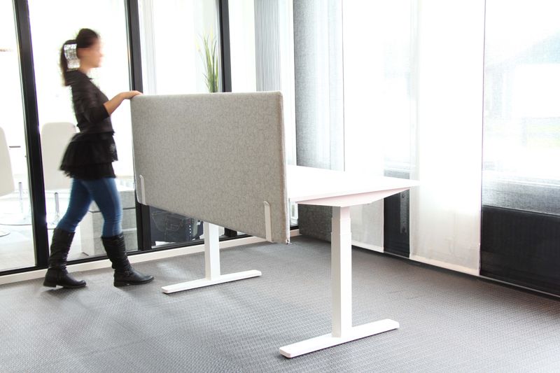 Ljudabsorberande bordsskärm uppbyggd med en träram fylld med 30 mm ljudabsorbent och 5 mm skumlaminerat tyg på vardera sida. Utan infästningshål. Kan enkelt flyttas från bordsfäste, fötter, väggfäste. Rundade hörn, radie 35. Fästen och fötter finns i silver, vitt och svart. Total tjocklek 40 mm. Klädd på båda sidor. Söm eller blixtlås runt om hela skärmen i färg. Fästena levereras i par. Bordsfästet skruvas i bordsskivan.