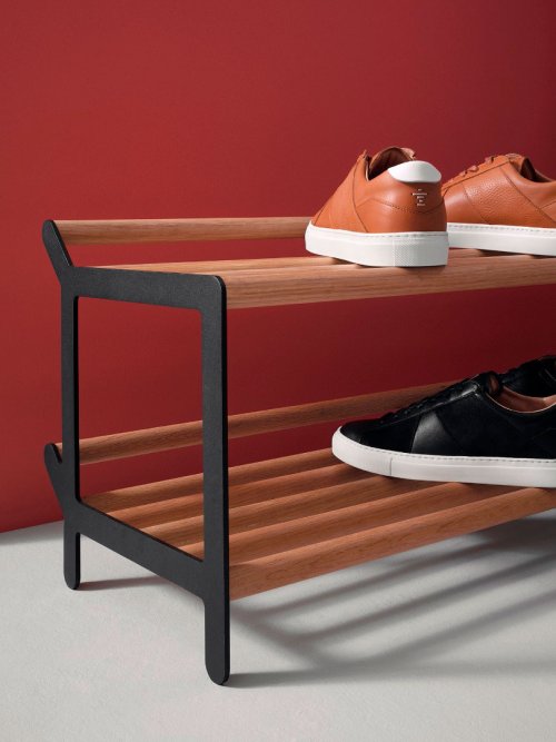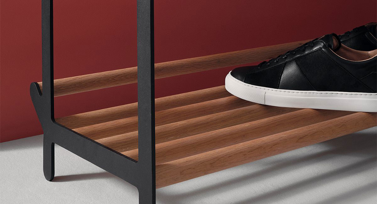 En hallmöbelserie designad av formgivaren Andreas Klippinge. Serien har hämtat sin inspiration ifrån Essems befintliga sortiment av hyllor, där designen låter materialet via produktionsmetoden svepa sig kring funktionen – som alltid är i fokus. Hyllan kommer i klarlackad ekrundstav med pulverlackerade konsoler. Fristående och robust skohylla som kommer monterad.