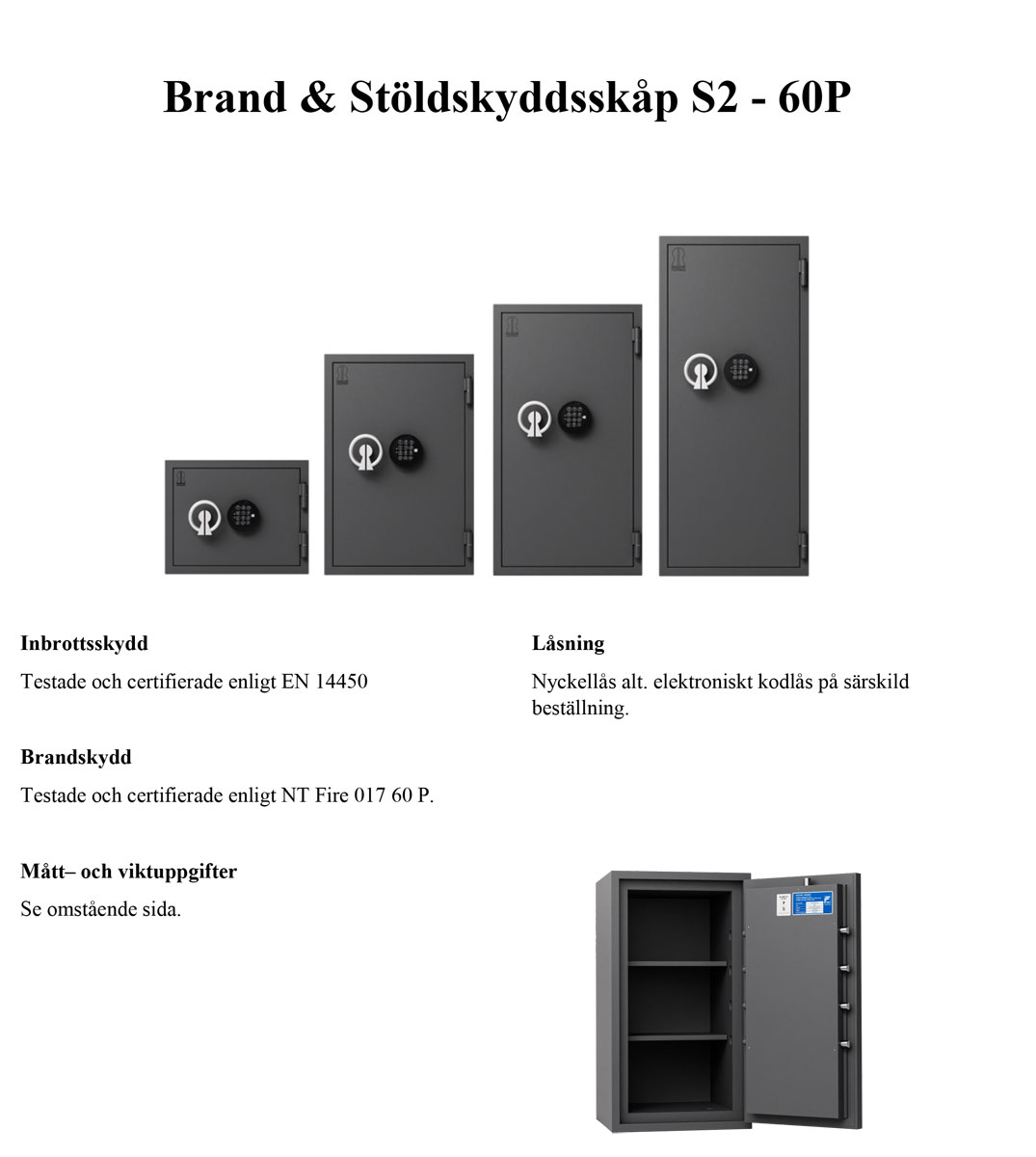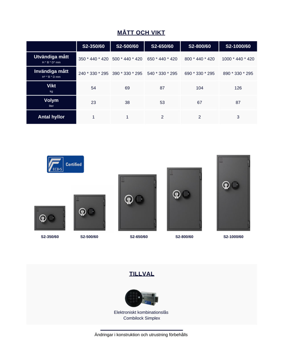 Brandskyddscertifierad av ECB-S enligt EN 15659 nivå LFS 60 (60 min. brandskydd för papper). Stöldskyddscertifierad av ECB-S enligt EN 14450 klass S2.