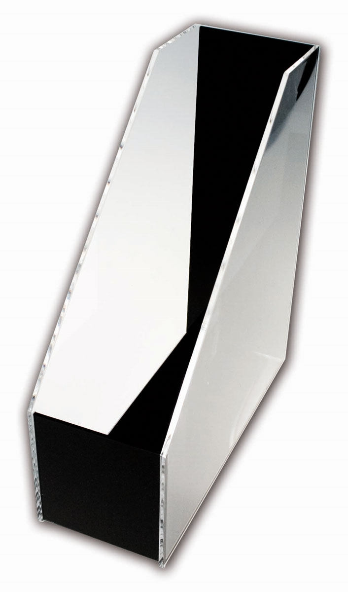 Tidsskriftssamlare i akrylSnyggt formgiven, handtillverkad tidsskriftsamlare i akryl. Anpassad för A4 format.Tidsskriftssamlaren är i svart och transparent akryl med måttet 280x260x95 mm.