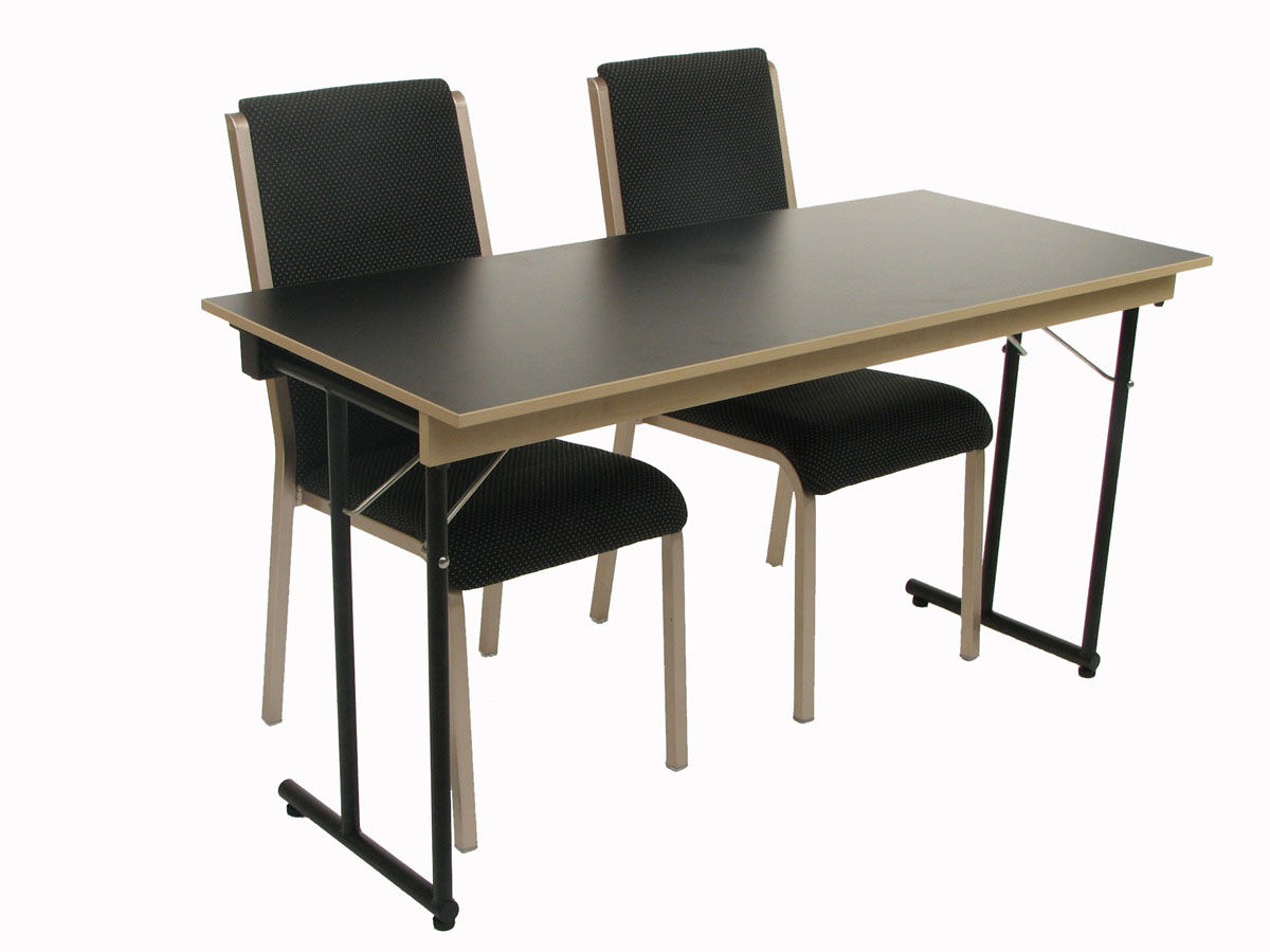 Ett stadigt och ekonomiskt bord med enkel fällanordning som snabbt kommer på plats när behovet finns. Passar lika bra för fast installation som för temporärt användande. Finns i ett antal storlekar, 120 x 50 cm, 120 x 60 cm och slutligen 138 x 60 cm. Höjd 73 cm. Skivan av melamin finns i olika färger och träslag. Om ni önskar kantlist i avvikande färg var vänliga och hör av er. Vagn som transporterar 10 bord finns som tillbehör.